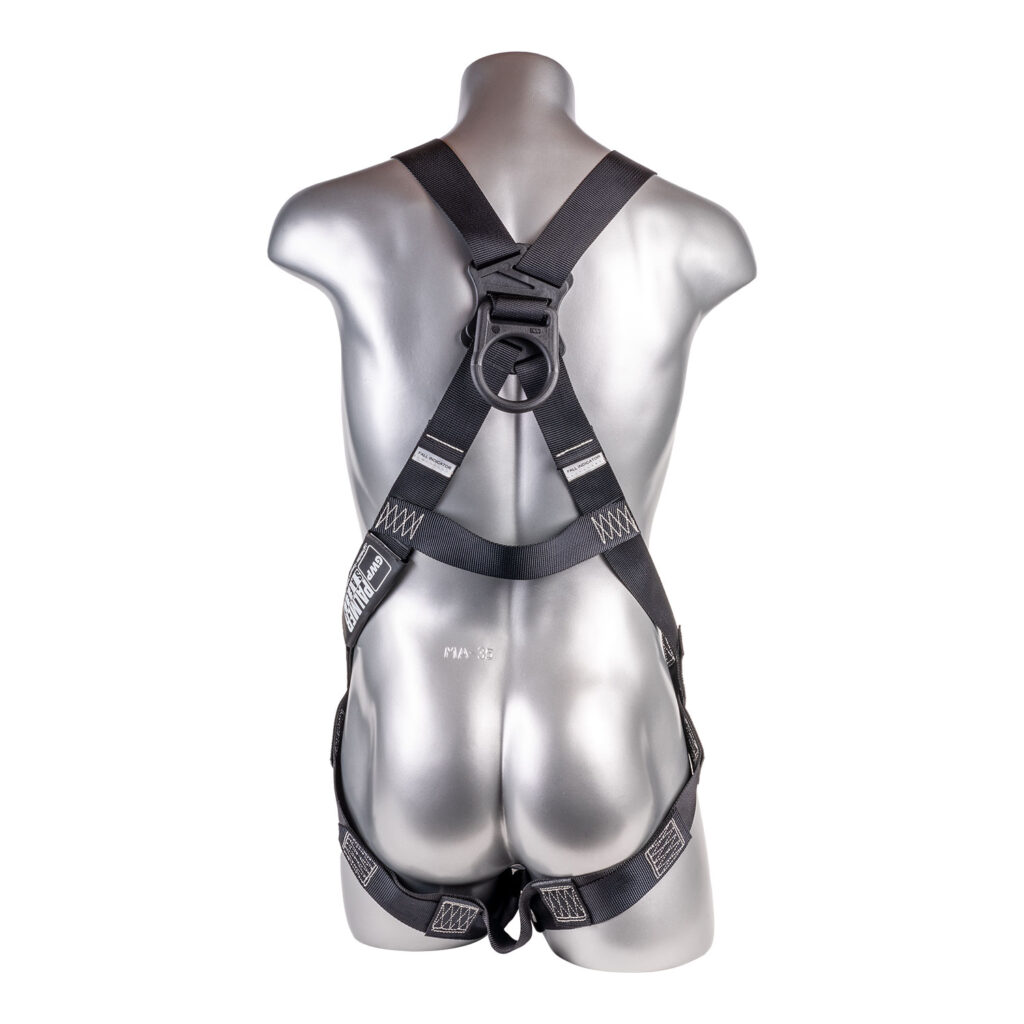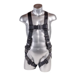 Black top, black bottom. Full body harness with 5-point adjustment, dorsal D-ring, pass though leg straps. All Dielectric hardware. Fall Indicators. Universal size. Meets or Exceeds ANSI Z359.11-2021. A10.32-2012.